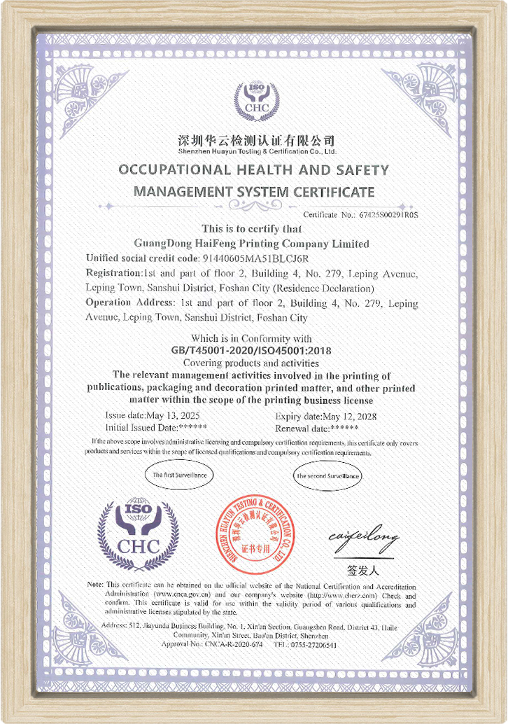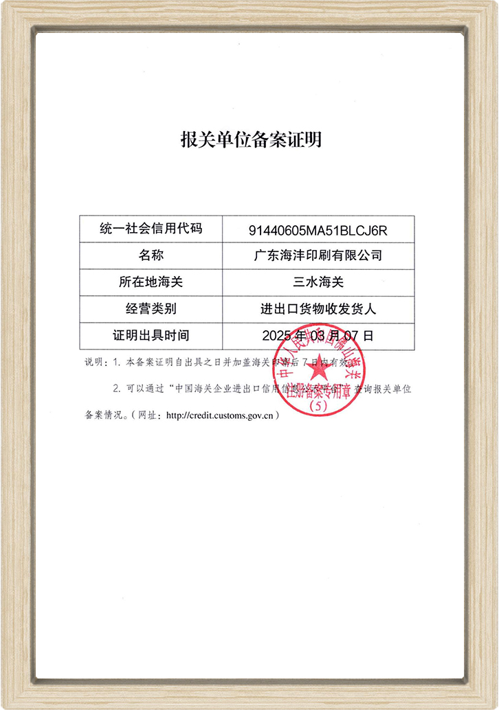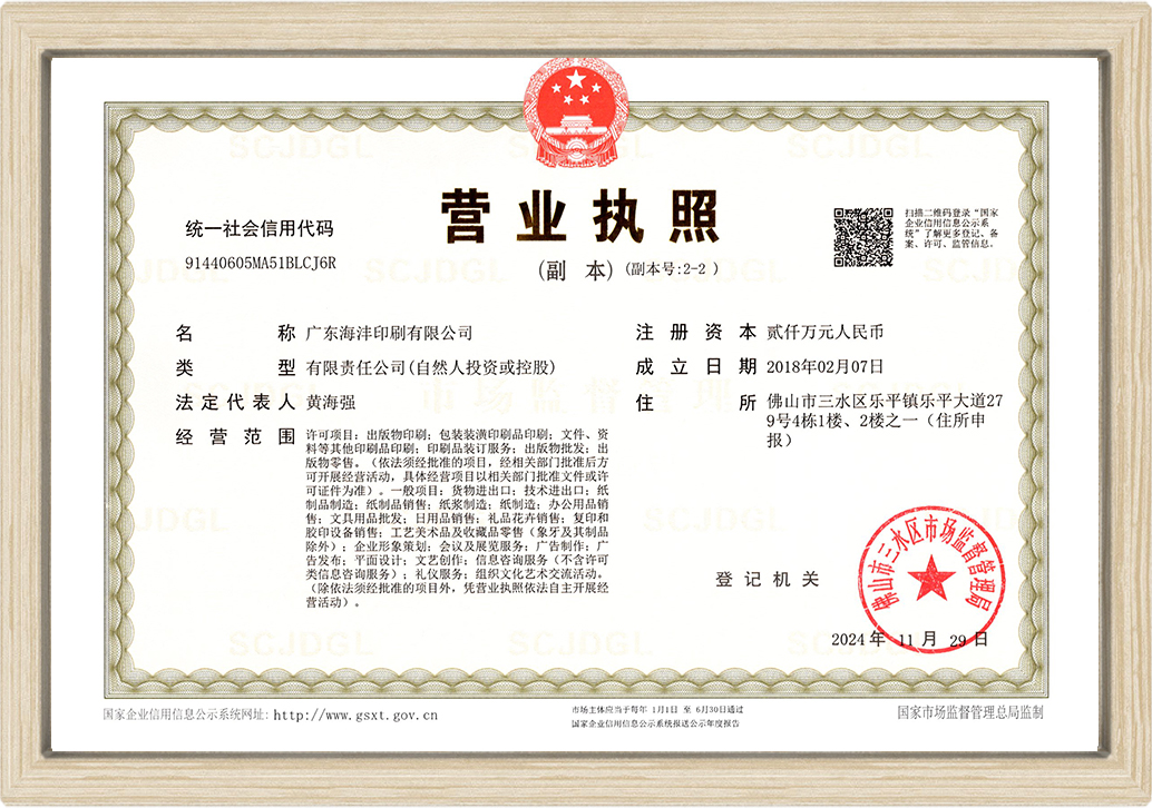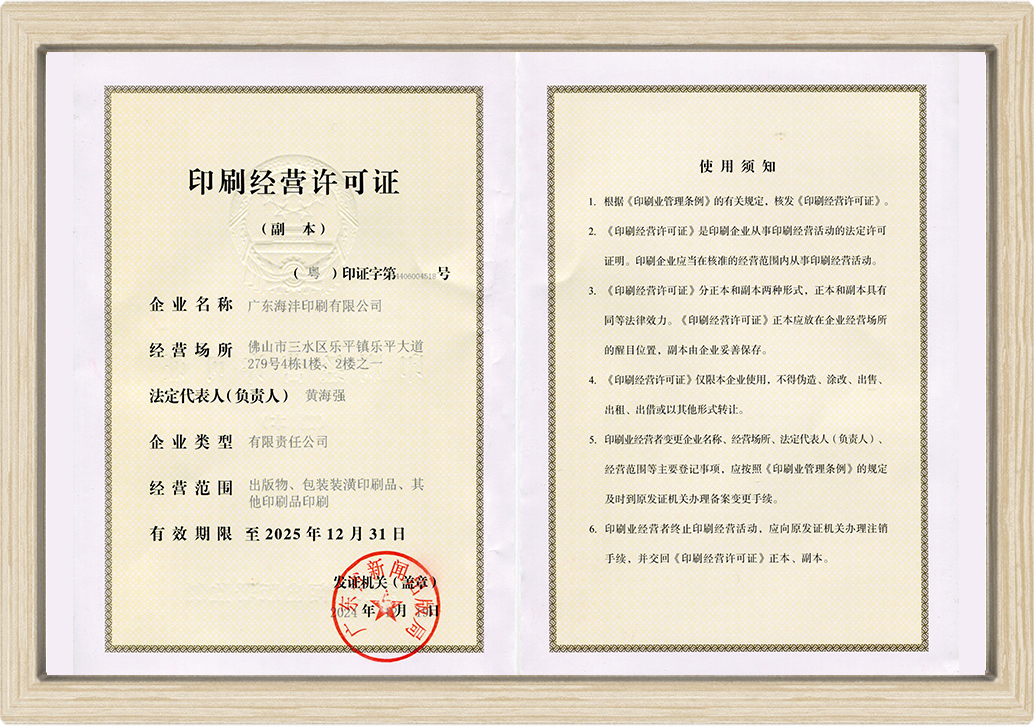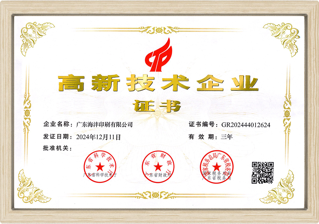 公司是国家高新技术企业、广东省大型工业企业。已取得出版物、包装装潢印刷品等印刷品印刷经营许可证,以及中国环境标志产品认证、ISO9001质量管理体系认证、ISO14001环境管理体系认证、ISO45001职业健康安全管理体系认证。也是广东省政府、佛山市政府定点印刷供应商、广东省“守合同重信用”企业。
