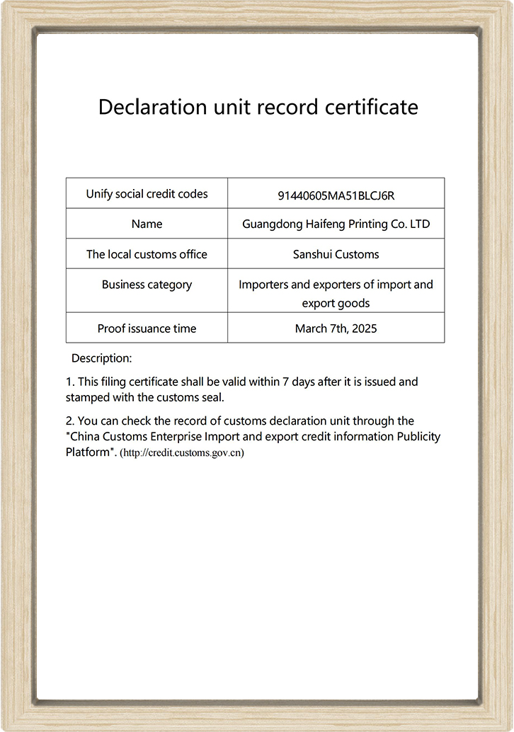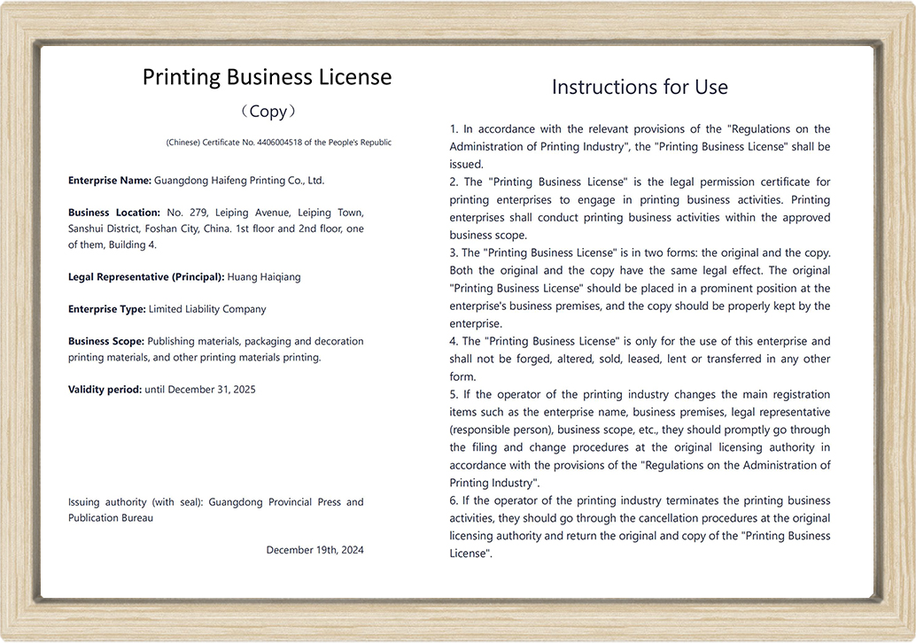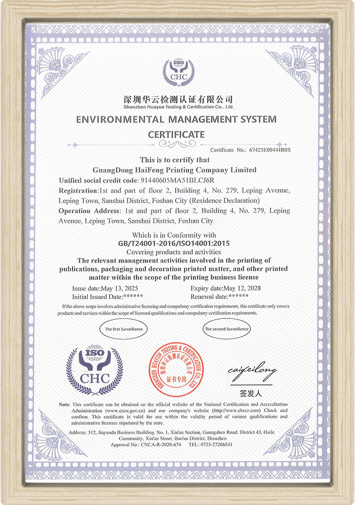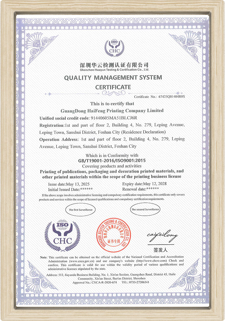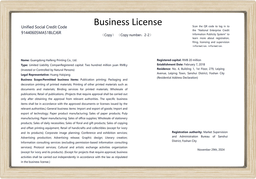 公司是国家高新技术企业、广东省大型工业企业。已取得出版物、包装装潢印刷品等印刷品印刷经营许可证,以及中国环境标志产品认证、ISO9001质量管理体系认证、ISO14001环境管理体系认证、ISO45001职业健康安全管理体系认证。也是广东省政府、佛山市政府定点印刷供应商、广东省“守合同重信用”企业。